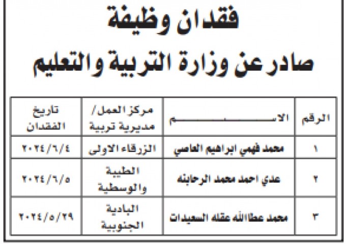 أعلنت وزارة التربية والتعليم، اليوم الخميس، عن فقدان عدد من موظفيها من مديريات مختلفة لوظائفهم.